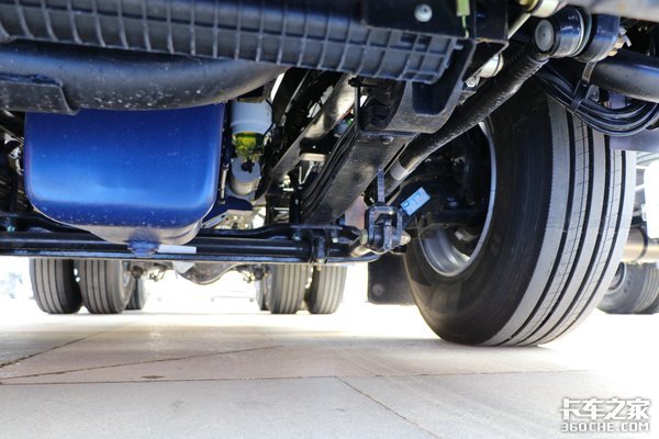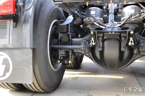 后桥采用的是汉德13吨MAN技术单机减速桥,后桥速比为4.11,另外这款车采用的是少片簧设计,可以降低自重,后桥匹配了5片板簧。