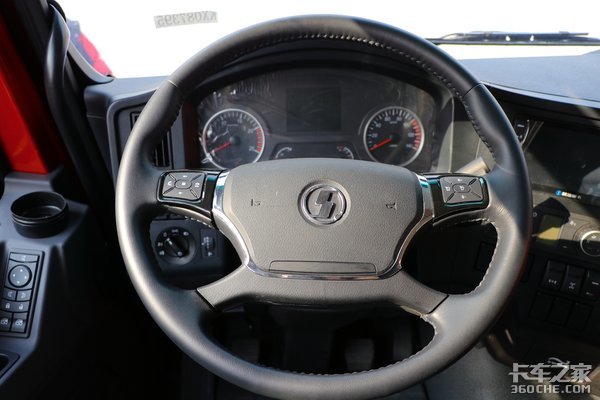 四幅式多功能方向盘采用真皮包裹,缝线很整齐,蓝牙电话、多媒体控制按钮、定速巡航按钮分别布置在两边,这一配置在如今的中高端牵引车中基本已经成为标配,不只是使用起来更方便,手不离方向盘操作也更安全。