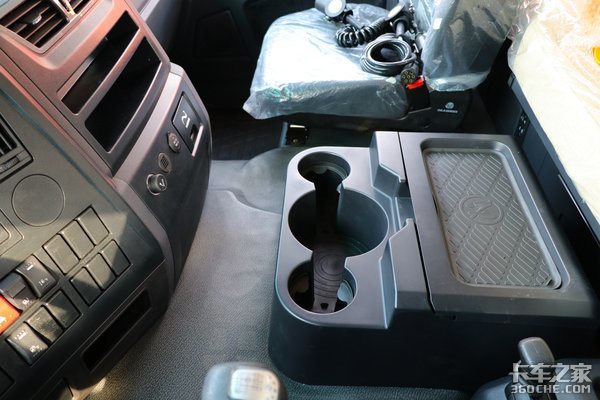主副驾之间布置了水杯和水壶的置物架,还有一个封闭式的储物盒,这也是驾驶室内的主要储物空间了。