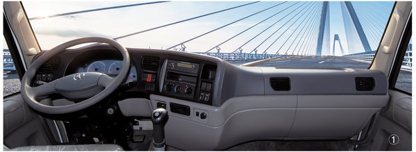 驾驶室宽大的风挡提供了更大角度的行车视野,内饰则以灰色为主色调,覆盖件采用皮纹包裹,提升驾乘人员视觉与触觉上的体验。仪表台则采用环绕式设计,各种按钮均触手可及,提高行车安全性。同时,该驾驶室采用平地板设计,为驾驶员提供宽敞舒适的驾乘环境。