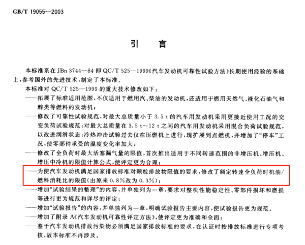 该标准规定:额定转速全负荷时机油/燃油消耗比不超过0.3%。不过这个只是一个测试方法,并不是国家强制规定。