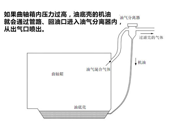 如果油气分离器出现堵塞现象,曲轴箱内压力过高,油底壳的机油就会通过管路、回油口进入油气分离器内,从出气口喷出。因此,曲轴箱内的废气循环不畅或不循环,也是造成机油流失的重要原因。