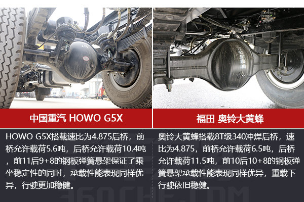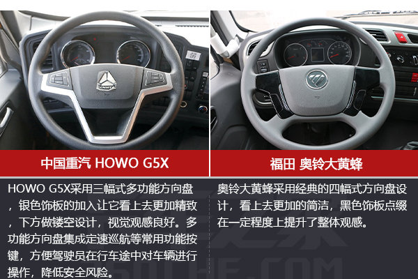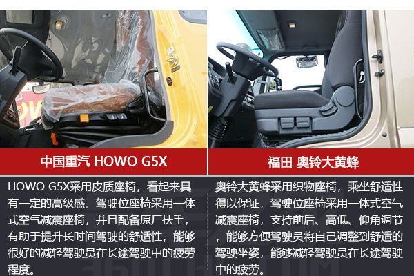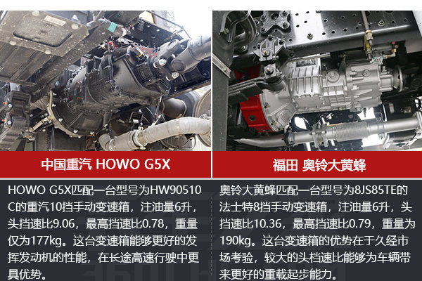 从两者的动力链匹配上看,HOWO G5X配备的大扭矩发动机+多齿比小速比变速箱的匹配在高速行驶工况下能够获得更加亮眼的表现。而奥铃大黄蜂的优势在于成熟的动力配备,低扭良好的发动机+大速比变速箱让它能够获得相对较好的重载性能,整套动力同样适合在国道和工况良好的高速公路上行驶。两者之间怎么选,还是要根据实际使用工况进行综合考虑。