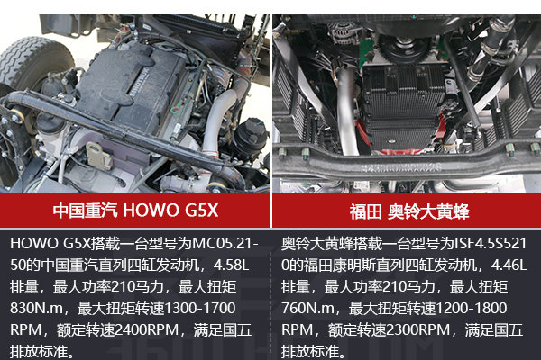 从动力参数上看,二者在动力性上相差不大,但在扭矩上HOWO G5X的性能更加突出,发动机更加有劲,但大黄蜂更加宽广的最大扭矩输出区间在一定程度上弥补了这一点的差距。不过二者均有较多的发动机版本可供选择,从公告上看,HOWO G5X有云内、潍柴与重汽不同版本共四款发动机可供选择,大黄蜂则有福康、东康及云内不同版本共九款发动机供选。在动力选择上还是要根据不同的使用工况,来选择适合自己的发动机,才是正确的选择。