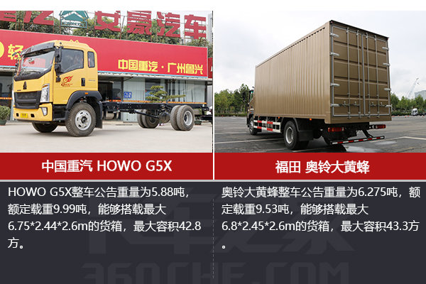 车型对比:中国重汽HOWO G5X中卡 2018款 物流版 载货车,厂商指导价(底盘) :16.7万元VS福田 奥铃大黄蜂 厢式载货车,厂商指导价:15.75万元。