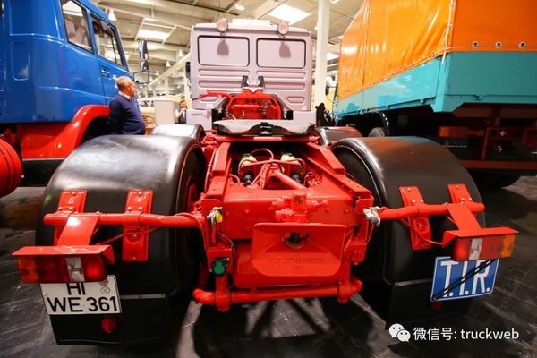 牵引车上使用6x2的驱动形式在欧洲并不少见,即便是采用双转向桥,德国人也不愿意采用日本人的解决方法,前双的布置形式还是留给日本卡车玩吧。第二根转向桥与驱动桥安装在一起,直到今天,仍有不少欧洲卡车使用这样的车轴布置。当然,随着技术的发展,中间的这个转向桥在今天很多都能够提升,但对于F8这样的老车,除了转向与承重功能,提升就别想了。