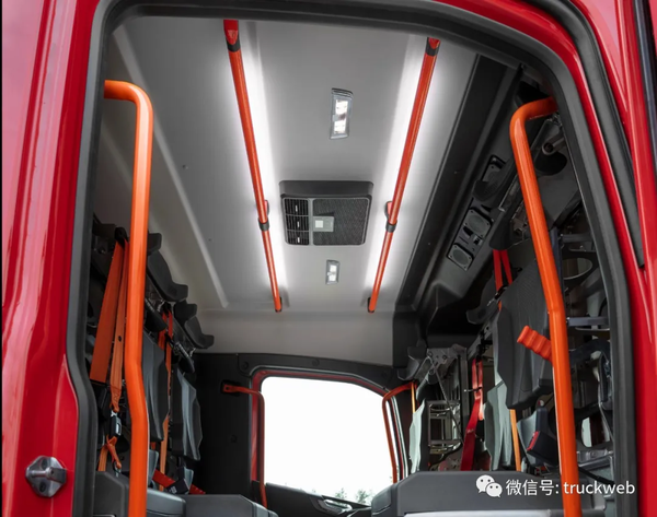 全新FMX Crew Cab驾驶室地板采用可水洗的材质,易于清洁。车门边的把手采用橙黄色涂装,在各种光线条件下都方便辨识。后排可以选装独立的空调系统,即便在炎热的夏天也能为全副武装的消防队员带来凉爽。