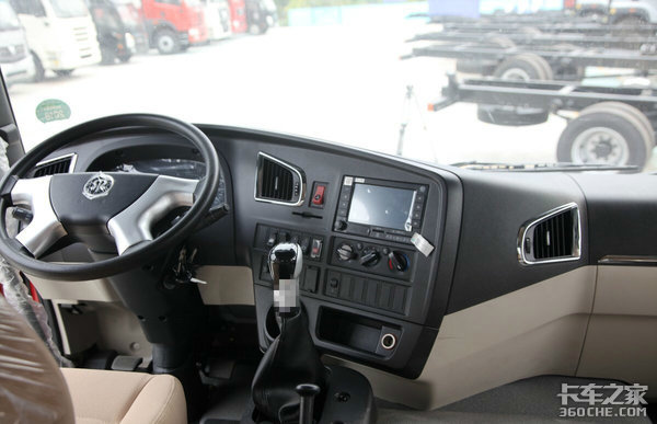 由三级踏板进入驾驶室。车辆并未配备多功能方向盘,米黄色与黑色的分色使得并不会非常单调。内饰主体上以简约为主。空调出风口增加有镀铬装饰件,起到内饰上的点缀作用。