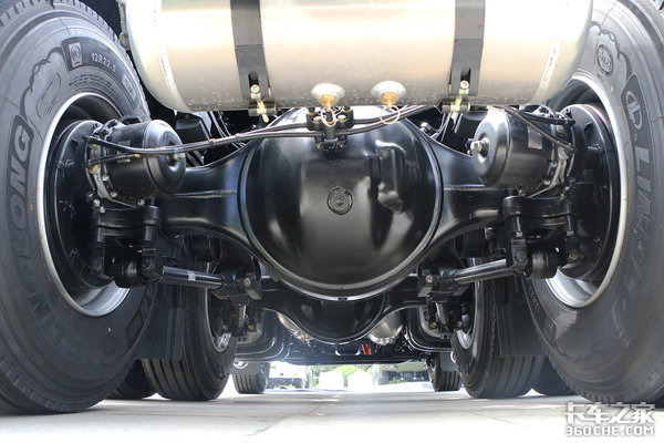 型号为汉德HDZ440后桥,速比为2.846,通过对主减速器等部分的重新设计,整体减重达到了173.3公斤。采用相应速度更快的楔式制动器,可以将刹车系统的响应时间提高50%。更快的制动响应时间,能够大幅度提高行车安全。