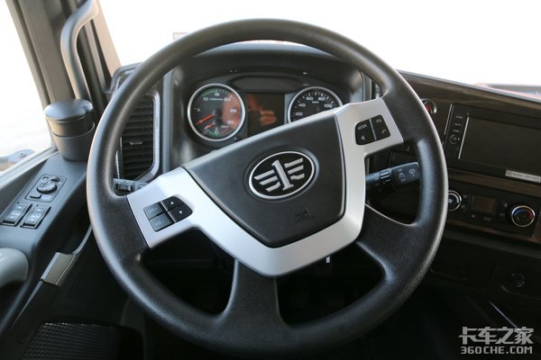 方向盘造型是卡友们熟悉的“一汽”味,四幅式多功能方向盘集成了菜单栏控制、接打电话功能以及音量调节模块,极大的减少了卡友在驾驶过程当中手离开方向盘的可能,进一步提升行车安全性。