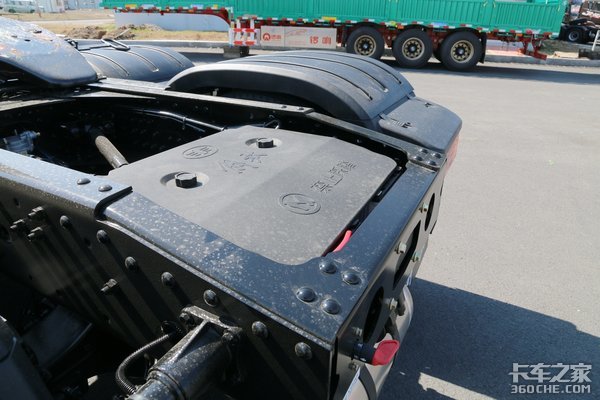 骆驼牌的电瓶容量达到了180Ah,被放置在了车辆尾部的电瓶架内,这种新式的布局主要是为了之后国六车型更大体积的后处理做空间上的妥协。