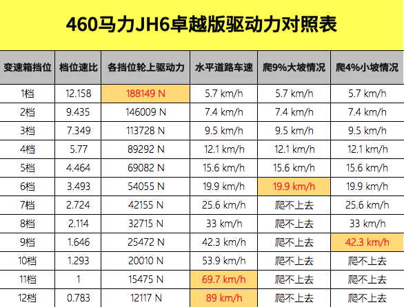 根据变速箱、发动机型号、后桥速比、轮胎尺寸,我们用卡车之家专业车速计算器计算可得,该车型在最高挡经济转速1300转时,时速可达89千米/时,头挡扭矩达188149牛米。