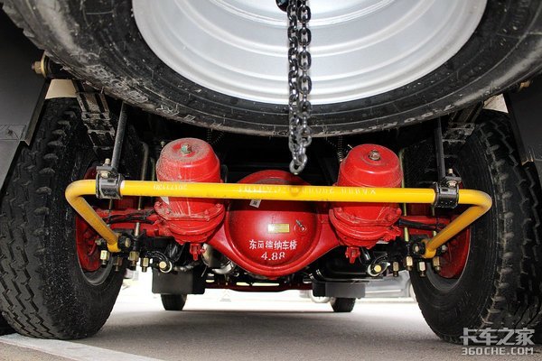 5吨后桥来自东风德纳,速比4.88。配备后桥横向稳定杆,能够提升行驶稳定性。德纳车桥在东风的车型上应用广泛,近年更新的红色涂装有个性成分,但更多的应该是对品质的自信。