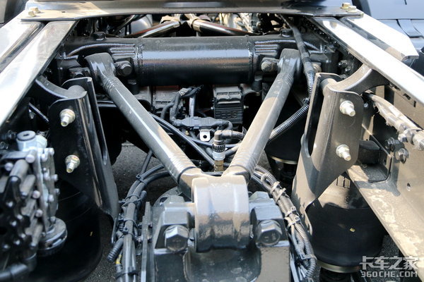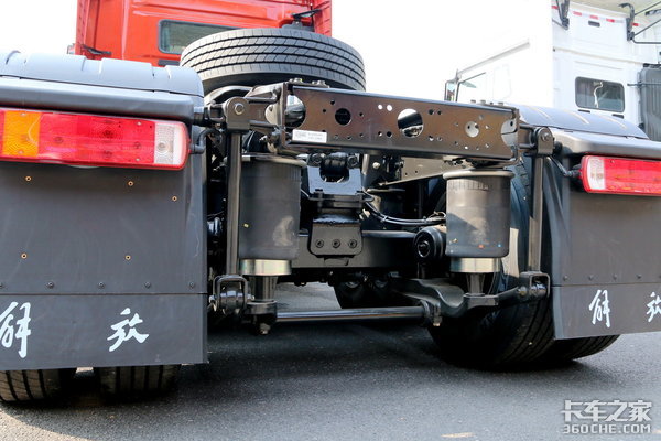 驱动桥方面,这款车采用了解放自主的498冲焊桥,驱动桥速比为3.417,采用气囊悬架。最后一桥为提升桥,带有横向稳定杆。