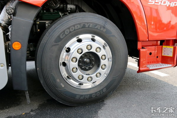 轮胎则是固特异品牌的295/80R22.5型号真空胎,车轮为铝合金材质打造。轮端超出我们的思维定式,采用了FAG品牌,没有选择康迈轮端,实际上FAG的性能实力与康迈相当。