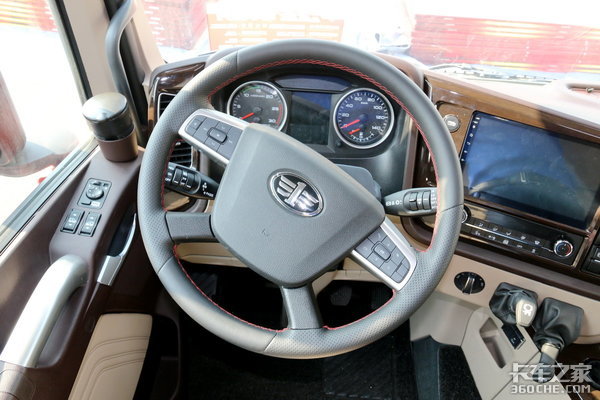 方向盘采用了全新的设计,跟解放J7使用了同款方向盘,相比之前JH6的方向盘,厚重感有了显著提升。外圈采用了皮质包裹并且带有红色缝线,看起来很高端。