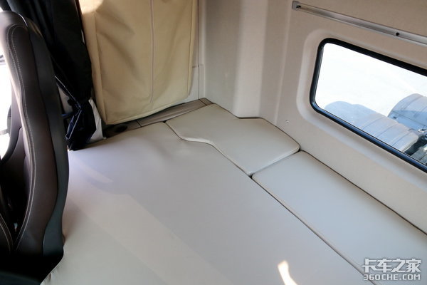 在正常跑车的时候,这款车的卧铺是标准化的,一个人在卧铺上睡觉都可以打着滚儿睡。但是半夜到卸货点或者有的地方等晚上才能通行时,夫妻俩人都要休息。两口子总不能一年四季都是上下铺睡觉吧,也得睡在一起增进一下感情,那么这台车的卧铺就这么诞生了。