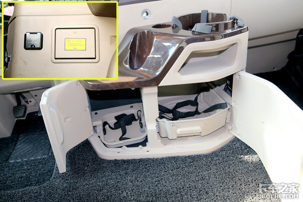 位于平地板上的储物岛,就是解放JH6独创的迷你厨房,储物岛下面可以打开,能够储放电饭锅、餐具等物品,上面带有固定绷带的水壶座可以放烧水壶。这里还带有1000W 220V的逆变独立电源,只要你想做饭,煮饺子,下面条,乃至吃火锅都没问题。