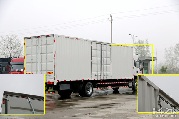 大家都知道,快递运输装载的货物大多都是纸箱,特别怕淋水。而货箱使用时间长之后,一般最先发生漏雨的地方就是厢门的密封胶条处。因此这款车在侧门和尾门处都增加了门檐,即便胶条老化,也能防止漏雨,保障货物的安全。