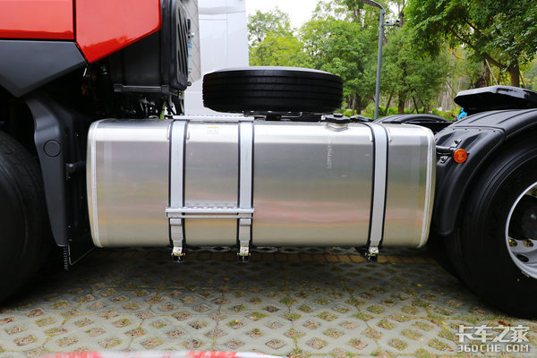 在长续航需求的前提下,其余组件进行优化设计,为巨大的双油箱让路。比如尿素溶液储液罐放在了驾驶室的后方、部分储气筒、蓄电池组被放置在大梁的尾部,从而提高大梁两侧的空间来布置油箱以及后处理系统。