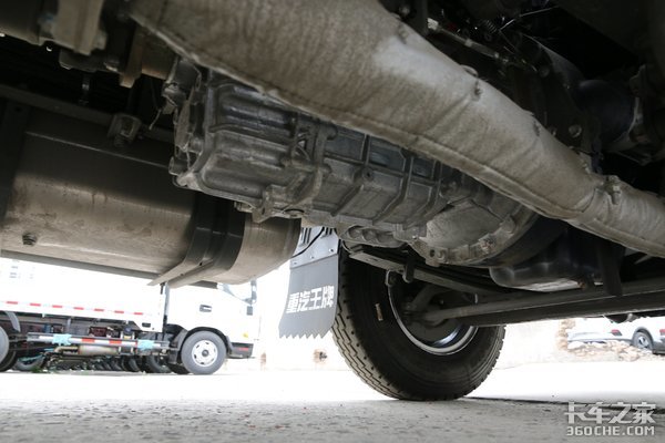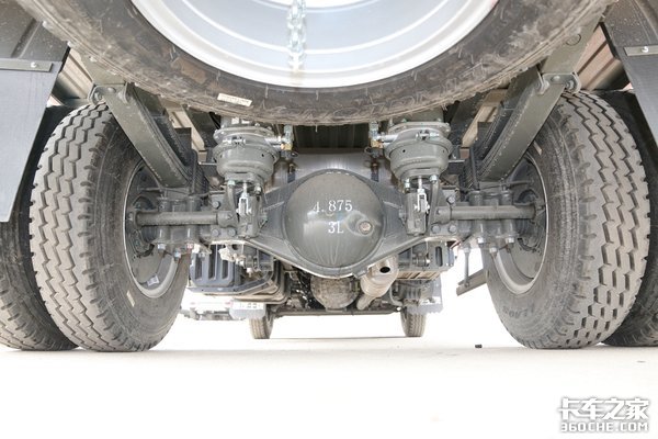 后桥为4.5吨级后桥,速比为4.875,搭配5+3片抛物线式版簧,前桥同样采用的是3片抛物线式版簧。