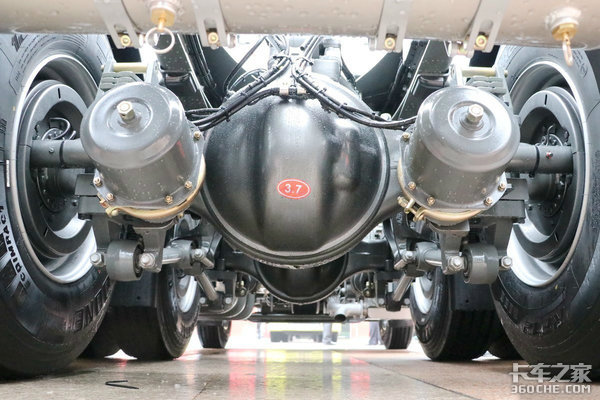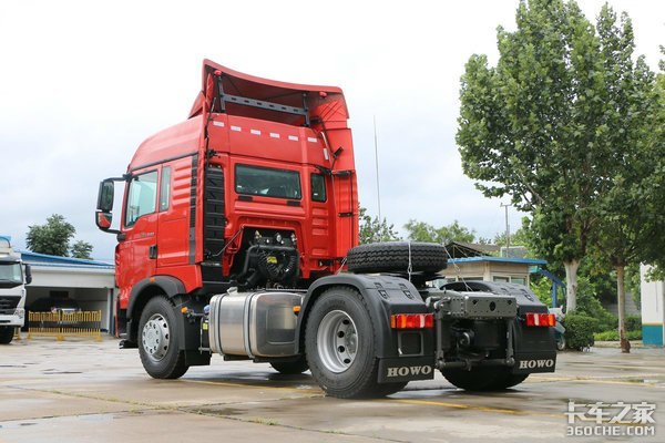 板簧配置上豪沃TX也更轻量化,前2片后3片的搭配再加上前轮用铝合金轮圈,铝合金储气筒,车架尾梁等轻量化设计,在自重上会有优势。