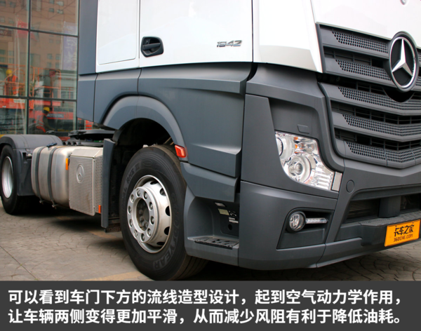从图上可以看到,奔驰新阿克托斯车门下方延长了不少,据介绍叫做车门延长。这样设计的好处,可以让车辆在高速行驶时,让流过车门两侧的空气更加平稳,以此来降低空气阻力降低油耗。