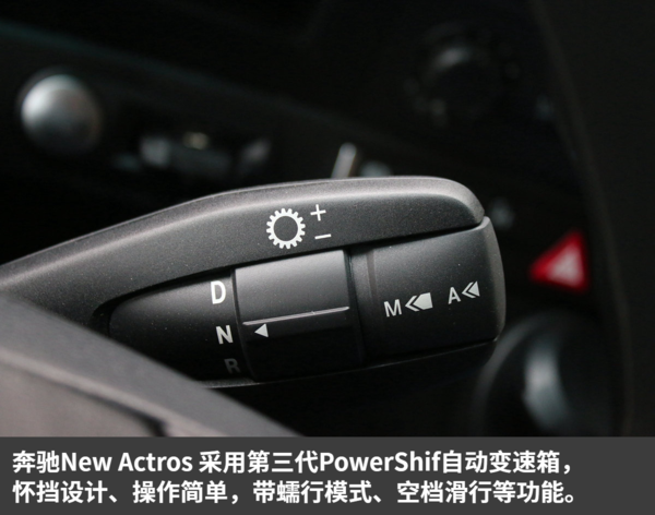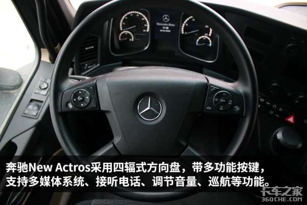奔驰新阿克托斯配备四辐式多功能方向盘,手感细腻,握着十分带感。方向盘左侧设有上下左右四个按键,以及加减按键和记忆功能按键。而右侧有巡航、限速按键及取消按键、车载电话和功能菜单按键。司机可通过多功能按键,完成车内大部分操作。尤其是便于开车时“盲操”,不用担心分心,影响驾驶。