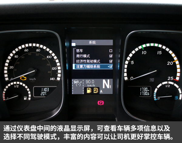 根据该车后桥速比、轮胎规格、变速箱传动比。通过卡车之家车速计算器可算出,车辆在1100-1300转经济区间时,时速为75-89km/h。