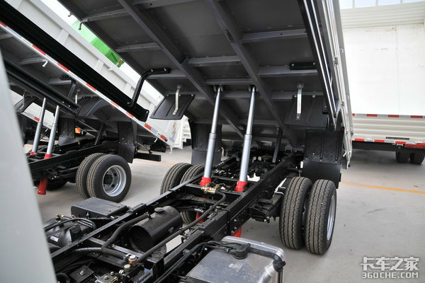 除了当平板车使用,有需要的时候它还能摇身一变成为自卸车,货厢下面有两根红色液压油缸,可将货厢举起,城市内装卸建材十分便利,体现了“小而多能”的特点。