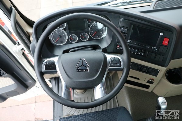 重汽家族经典的四幅式方向盘和仪表台、中控台的配色协调,整体感很强。