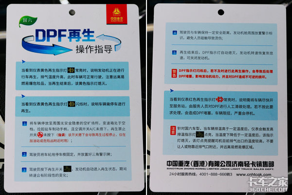 考虑到部分用户还不会使用国六车辆的DPF,重汽HOWO轻卡随车准备了操作指南卡片,避免驾驶员误操作损坏后处理系统。