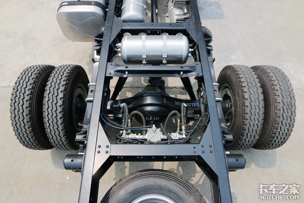 车桥和车架均进行了加宽设计,其中轮距宽度达到约2300mm(轮胎最外处),车架宽达到865mm。这样的设计能够能够更好地匹配大货厢,从而提升行驶稳定性。