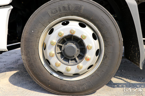说完了T5轿运版的动力链,最后咱们介绍一下底盘,从左至右先来看卡车的鞋。这台T5轿运版使用了型号为315/60R22.5的小扁平比轮胎,整车高度进行了有效降低,由此带来的好处就,相比于传统平头轿运车,T5轿运版车头上方能多装一台车,优势非常明显。