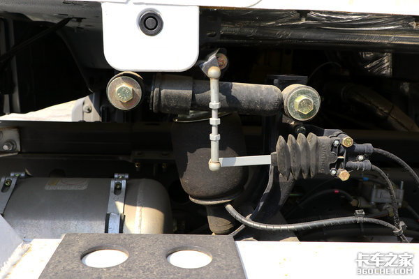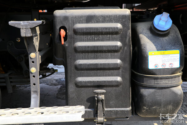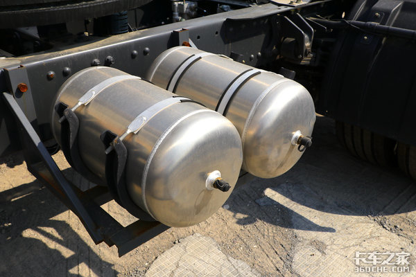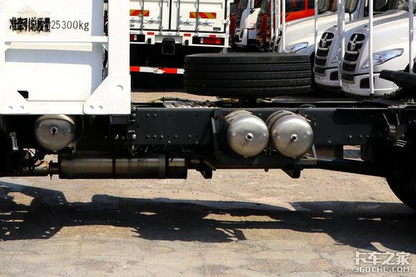 储气筒为铝合金材质对于车重的减轻能有一定帮助,总体来看底盘整体布局非常紧凑,配合上加长的车架,显得底盘空间非常充裕,这样即使未来增加国六版本车型,后处理也同样放得下。