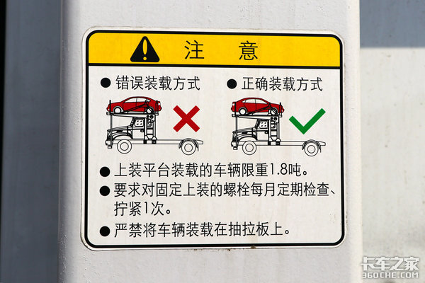在车门把手旁边还出现了一个警示标志,这是在提醒我们如果车顶装配轿车时要将车辆倒上平台。