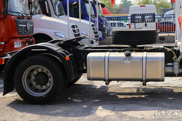 底盘右侧布置了油箱,容积450升,按照该车百公里25升油计算,450升油可以使它拥有1800公里左右的续航能力,这意味着如果从长春拉轿车到北京,再从北京拉轿车回去,中间只需加油一次,很好保证了时效。