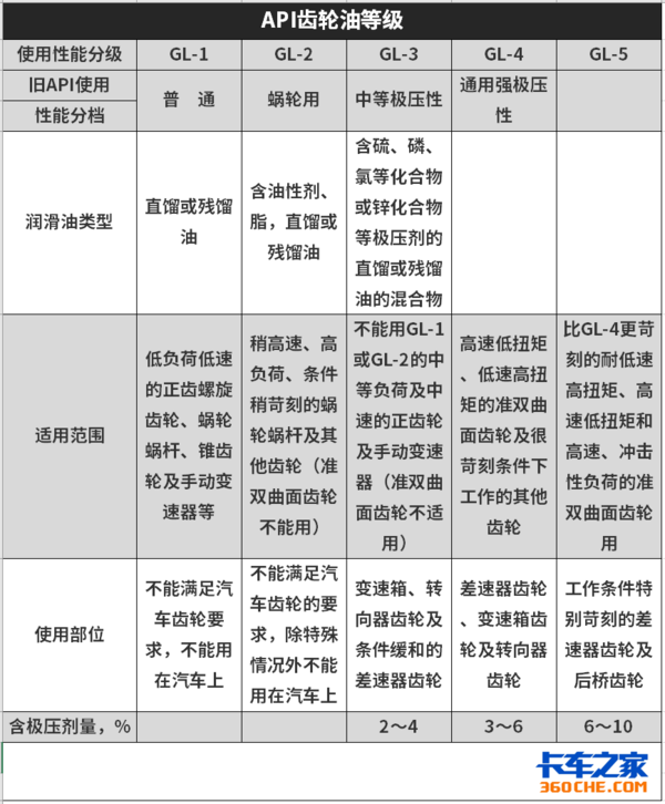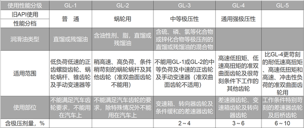 美国石油学会API就针对车辆齿轮油进行了性能划分。目前齿轮油共有5个等级。具体性能如下所示。