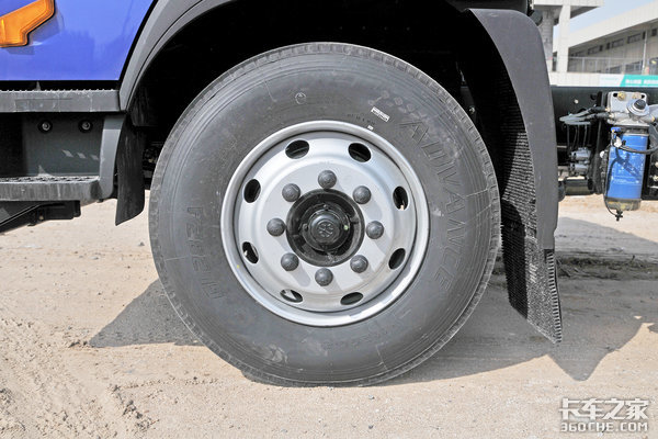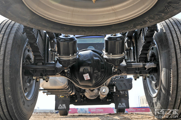 实拍车搭配汉德8.5吨后桥,速比为4.875,前桥搭载4.2吨桥,全车为鼓式制动系统,采用前9后11+8多片簧悬架,整体动力链匹配在应对普货运输时会更加从容,动力和承载能力都能得到兼顾。