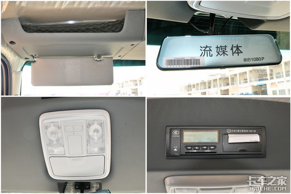 驾驶室顶部除了两侧的储物格之外,还布置有行驶记录仪和眼镜盒,并且装配流媒体车内后视镜。