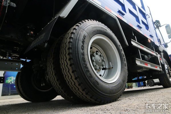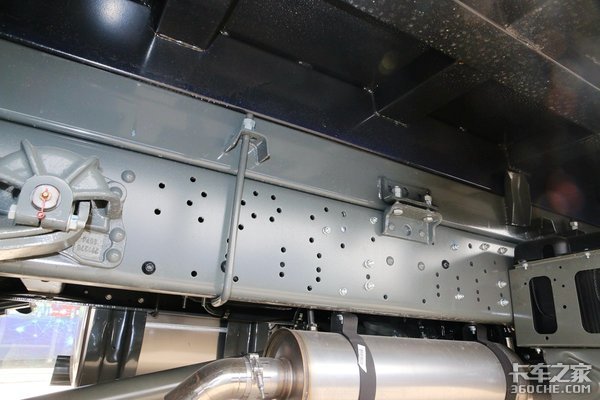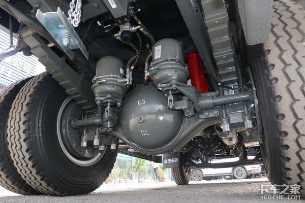全系采用10吨级后桥(实拍该车速比6.5),并且安装了11/11+9片钢板弹簧,可以看出该车不俗的承载能力。