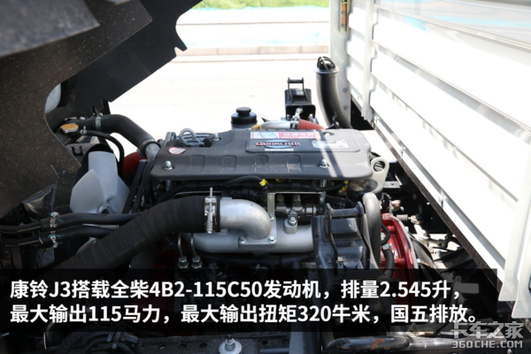 康铃J3轻卡搭载专供江淮的全柴4B2-115C50发动机,排量2.545升,最大输出115马力,最大输出扭矩320牛米,满足国五排放标准。全柴小排量发动机已经广泛用于轻量化轻卡上,不仅性能出色,自重还更轻。而对于目前标载物流运输来说,115马力已经足够应付大多数物流场景,经济性更佳。