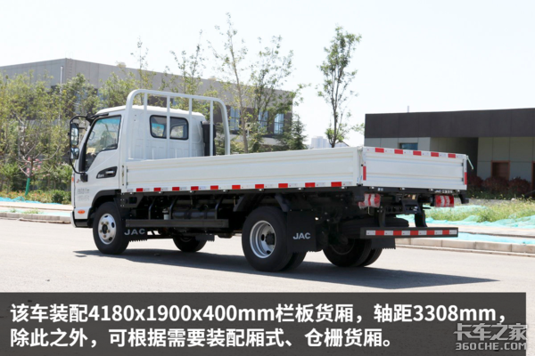 为了全方位迎战最有一公里运输市场,康铃J3为卡友提供多样化配置。可选装单排、排半驾驶室,不同轴距车型,栏板、厢式、仓栅货厢。其中轴距涵盖2850-3308mm,单排货厢尺寸涵盖3700-4180mm,排半货厢尺寸涵盖3370-3850mm,货厢宽度最大1.9米,厢式货厢容积最大17个方。同时,低货台设计保证了装卸便利性。