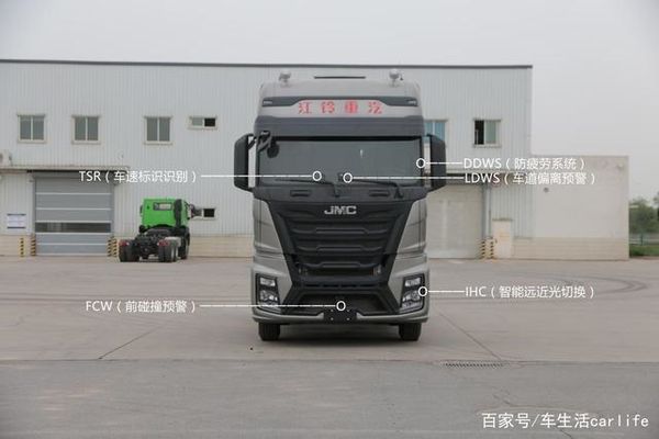 升级国六标准之后的车型依然沿用了国五版本的驾驶室。从外部来看,较国五车型来说多了几个传感器,其功能汇总为:LDWS车道偏离预警/FCW前碰撞预警/TSR车速标识识别系统/IHC智能远近光切换/AEBS自动紧急刹车系统等功能。