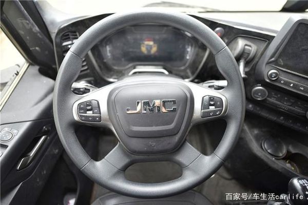 江铃威龙HV5采用高顶平地板设计,驾驶室宽2.5米,内高2.13米,坐进驾驶室我们首先看到了四幅式多功能方向盘和全液晶式的仪表盘。方向盘上集成了蓝牙电话,多媒体按键及定速巡航功能,全液晶仪表盘的信息显示度非常全面,尤其有一点非常贴心——仪表盘上如果蹦出故障灯,同时一定会加上文字说明,并且告知解决方案,这点是相当实用的。