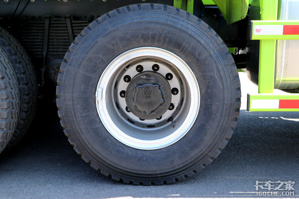 底盘部分先来看轮胎,为更好控制车身高度这台车使用了11.00R20小直径轮胎,整车高度得到有效降低。轮胎品牌为佳通,该轮胎主打耐磨以及大摩擦力,非常适用于搅拌车等工程车辆使用。