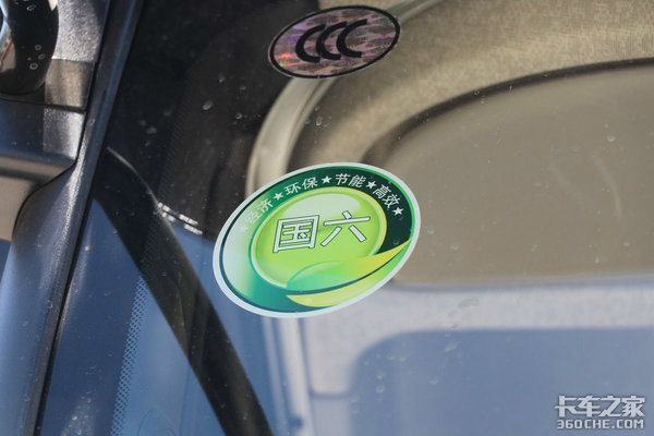 为了体现国六的身份,挡风玻璃的角落上贴有“国六”的绿色标签,注明“经济”、“环保”、“节能”、“高效”等字样。