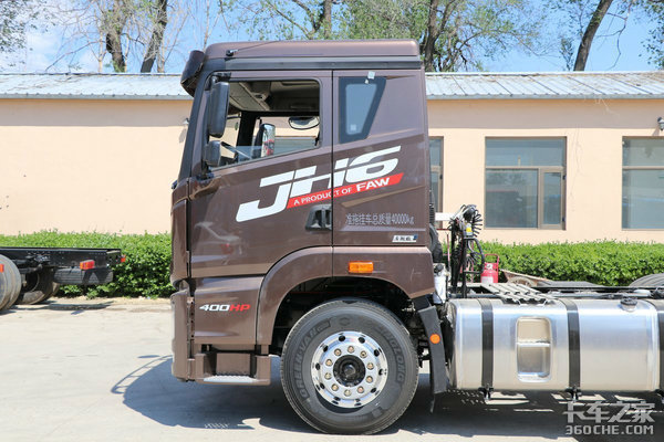 侧面来看JH6平顶驾驶室就憨态可掬,没有导流罩。JH6的装饰贴纸在平顶驾驶室上得到了保留。短途用来运输砂石料会是一个和谐的搭配。