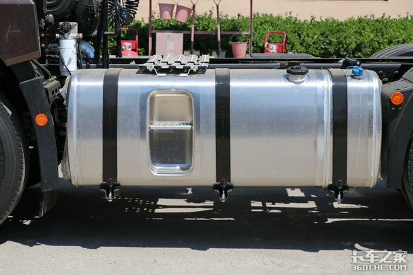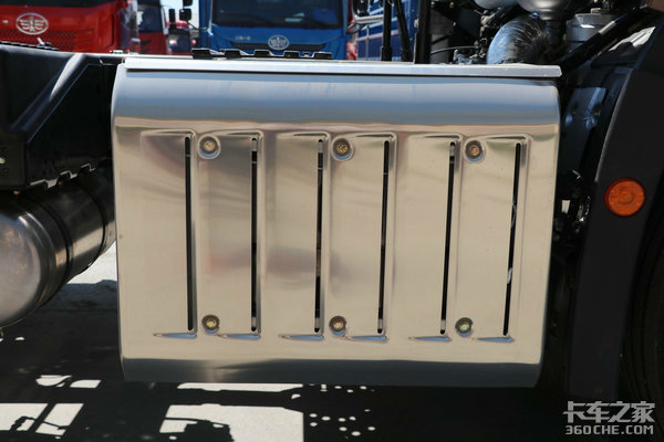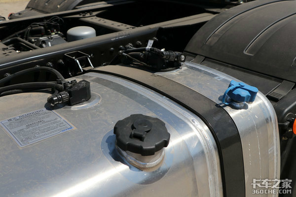 油箱容量大约600升,凹槽集成了登车梯,便于使用。需要注意的是尿素箱也与油箱焊接在一起,最右边蓝色的小盖子是用于加注尿素的,不要与油箱加注口搞混。