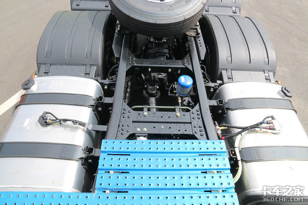 解放J7可搭载465和498两种规格后桥,实拍车搭载465升级冲焊桥,速比为2.688,车辆采用前少片簧后八气囊悬挂,这也是解放为满足法规和用户需求而主推的车型配置。